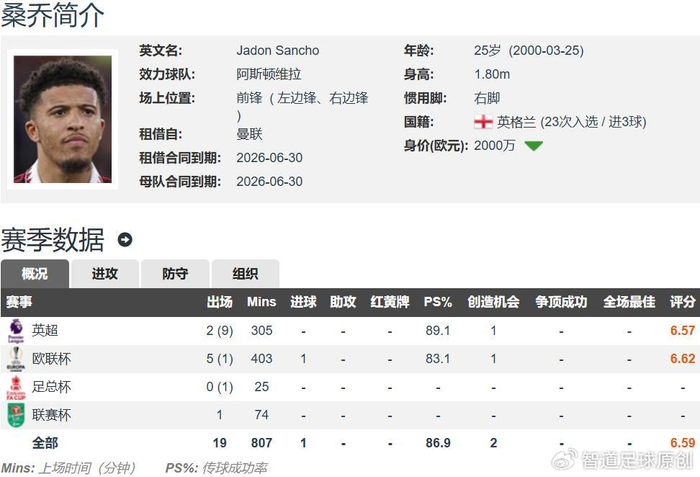 现年25岁的桑乔,本赛季被曼联弃用,外租至阿斯顿维拉效力,英超出场11次,其中仅有2次首发,合计出场305分钟,0球0助;欧联杯出场6次,其中5次首发,合计出场403分钟,打入1球,足总杯和联赛杯各出场1次,没有参与进球。桑乔目前在德转的身价仅降至2000万欧元。